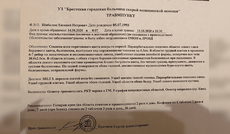 Am 9. August 2020 hatte Ewgenij Schabaljuk an einer Demonstration in Brest teilgenommen. Als er verhinderte, dass Polizisten einen seiner Freunde aus der Protestveranstaltung ziehen konnten, gingen diese mit Schlagstöcken auf den Familienvater los, bevor dieser schließlich fliehen konnte.